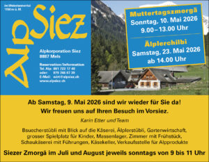 Wir freuen uns auf Ihren Besuch am Muttertagszmorgä vom Sonntag, 10. Mai 2026 oder an der Älplerchilbi vom Samstag, 23. Mai 2026. Bevor die Alpen bestossen werden, treffen sich Älplerinnen, Älpler, Alpen- und Bergfreunde zur gemütlichen Alpauffahrtschilbi im Alprestaurant Siez. Musikalische Unterhaltung mit dem Trio Furschbach.